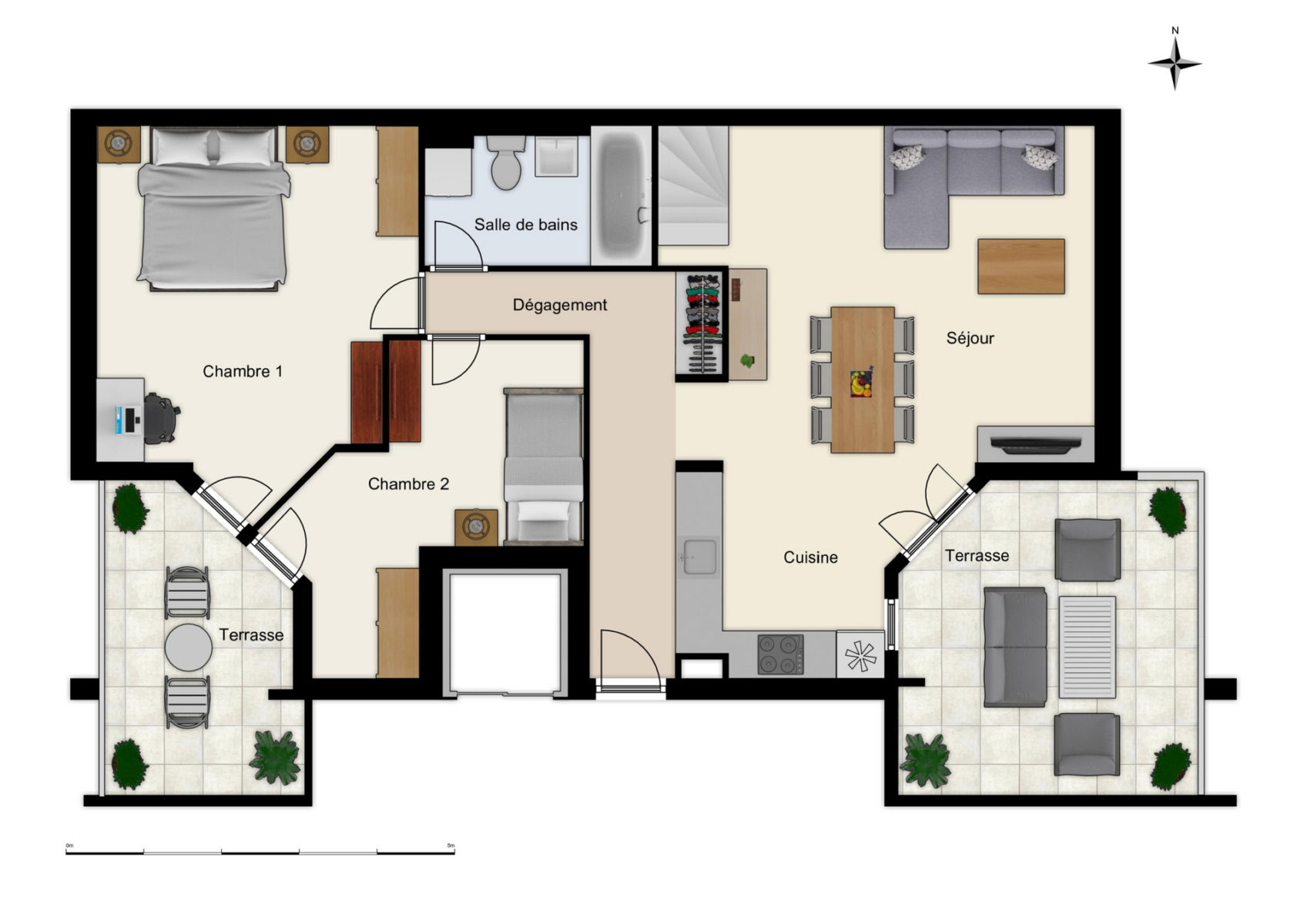 Ensoleillé et lumineux, ce bien se compose d’une vaste pièce de vie, une cuisine moderne, entièrement aménagée et ouverte sur la salle à manger ainsi qu’une terrasse joliment arborée.