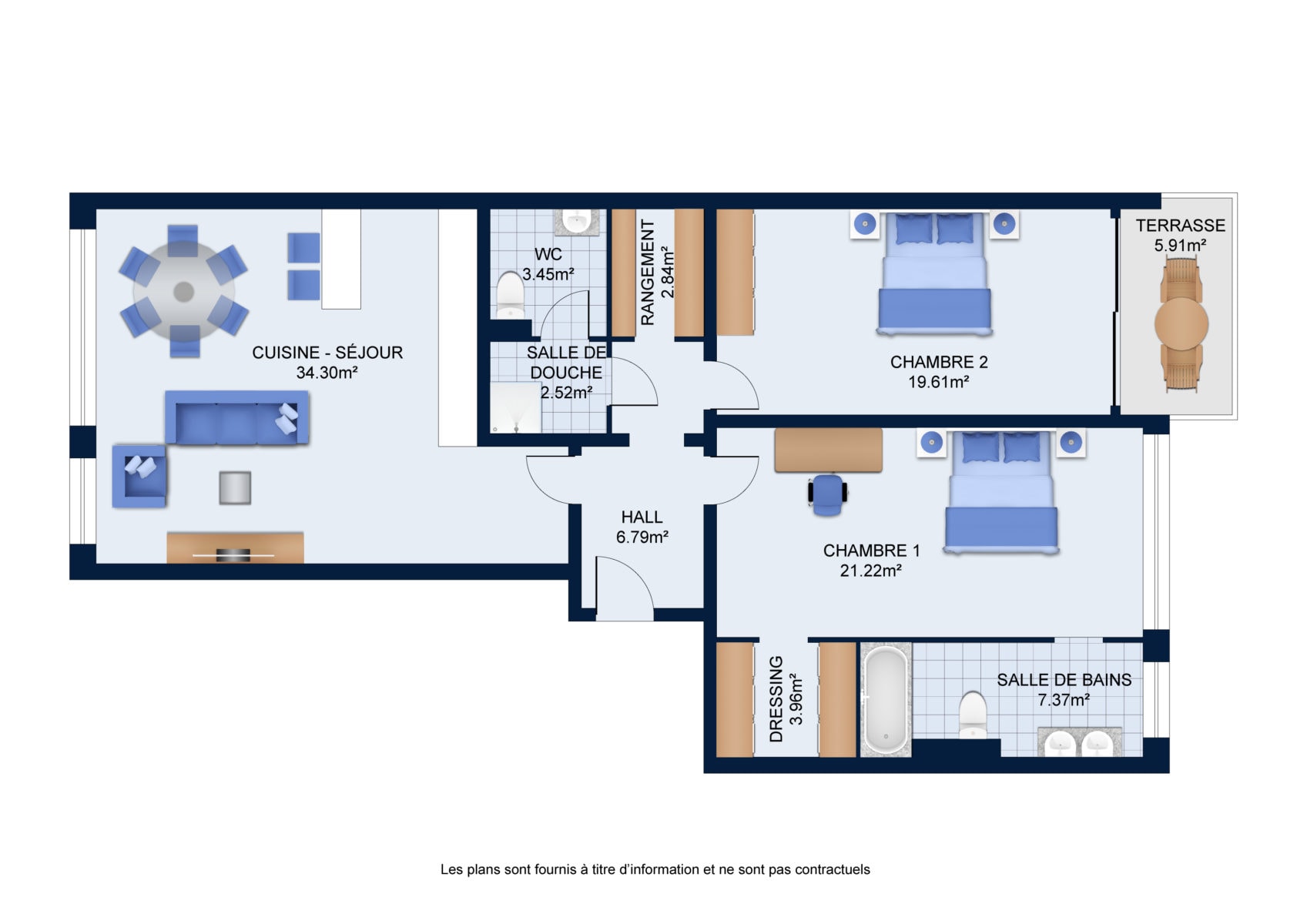 Lumineux et traversant, ses cent seize mètres carrés se déclinent ainsi : joli hall d’entrée donnant accès à une vaste pièce de vie : salon-salle à manger avec cuisine entièrement équipée et ilot central.