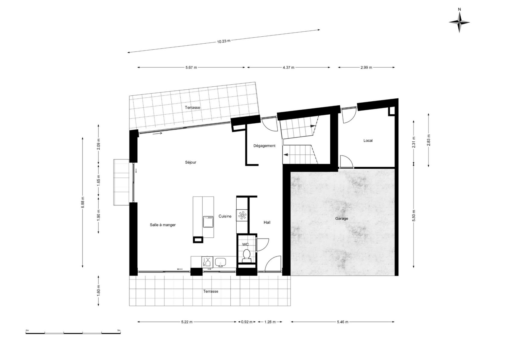 Le rez-de-chaussée s’ouvre sur de beaux volumes dont une cuisine ouverte entièrement équipée ainsi qu’un espace salle à manger et séjour.