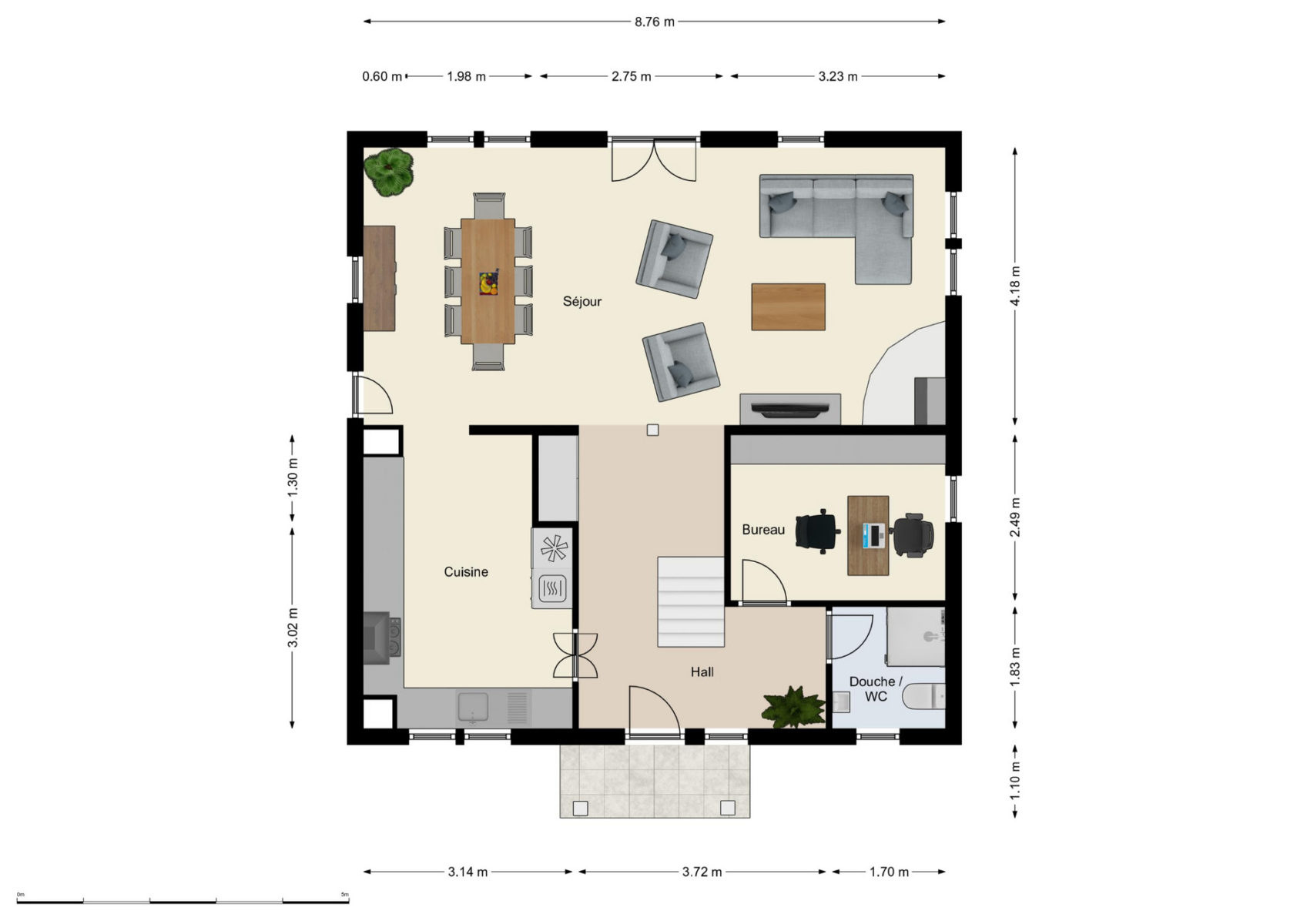 Les 3 pièces lumineuses du rez-de-chaussé offrent un espace fonctionnel avec une douche contemporaine, un bureau et une cuisine semi-ouverte intégrée au séjour, salon et salle à manger avec cheminée scandinave.