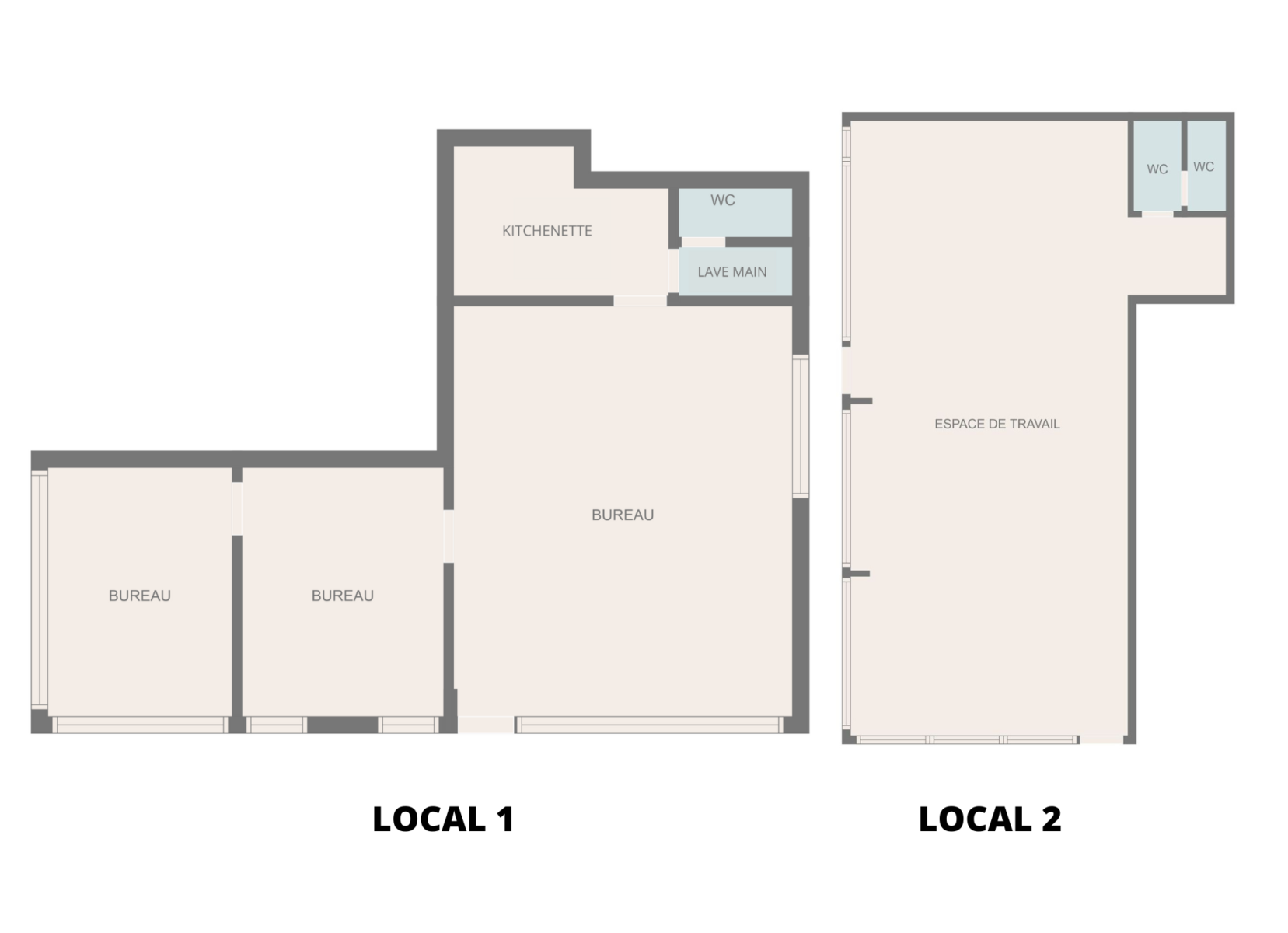 Local 1 : grande pièce de réception, Salle de réunion, Bureau, Cuisine, Toilettes,