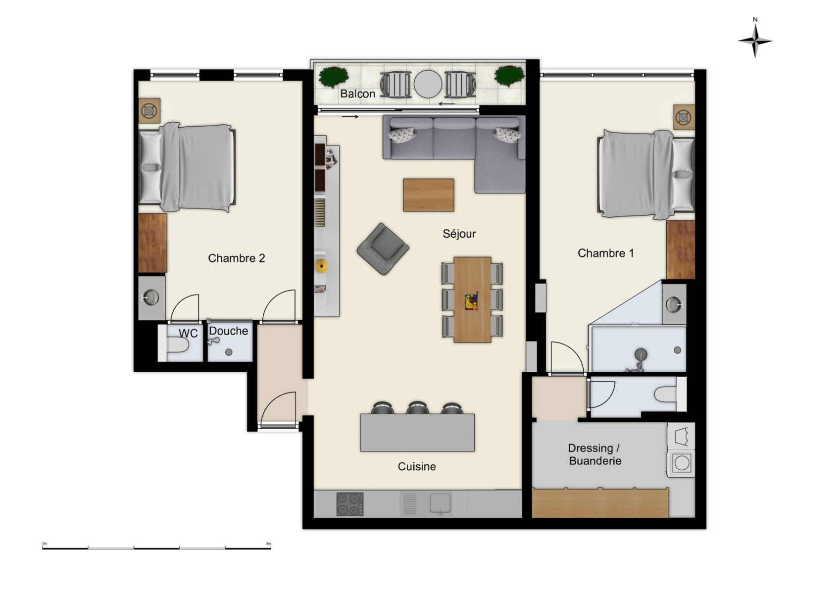 Il offre une belle entrée ainsi qu’un spacieux salon-salle à manger avec balcon et une cuisine intégrée.